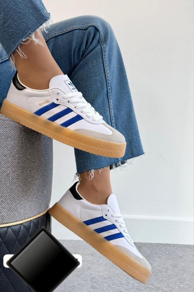 Beyaz kadın spor ayakkabısı, mavi çizgiler ve lastik tabanlı, bağcıklı tasarımla günlük rahat kullanım için uygundur. ♀️