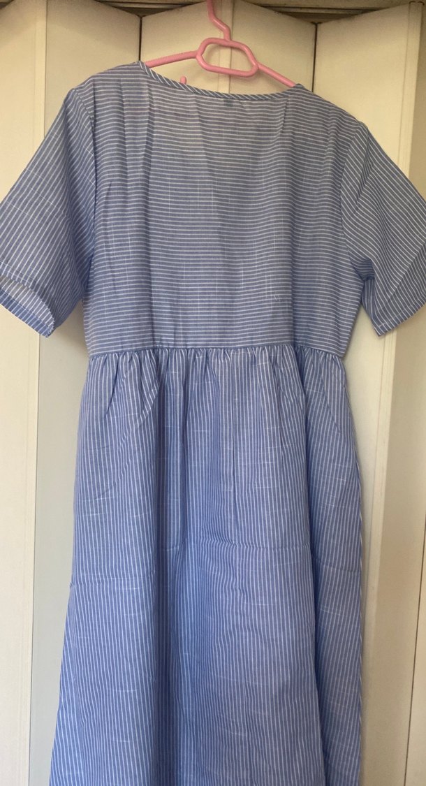 Yumuşak keten kumaştan, kısa kollu ve tekne yakalı bol kesim hamile elbisesi. Pileli tasarımı ve midi boyu günlük kullanım için uygundur. Mavi çizgili deseniyle klasik bir görünüm sunar.
