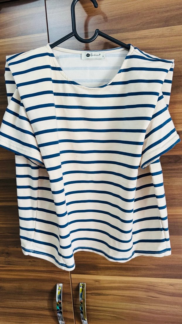 Kısa kollu, yuvarlak yakalı, mavi çizgili ve pile detaylı bol kesim hamile tişörtü. Yumuşak pamuk kumaştan, günlük kullanım için uygundur.