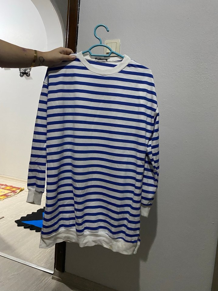 Yumuşak pamuklu kumaştan, uzun kollu, mavi çizgili hamile tişörtü. Rahat kesimi ve yuvarlak yaka detayıyla günlük sokak stili için uygun, konforlu ve şık bir parça.