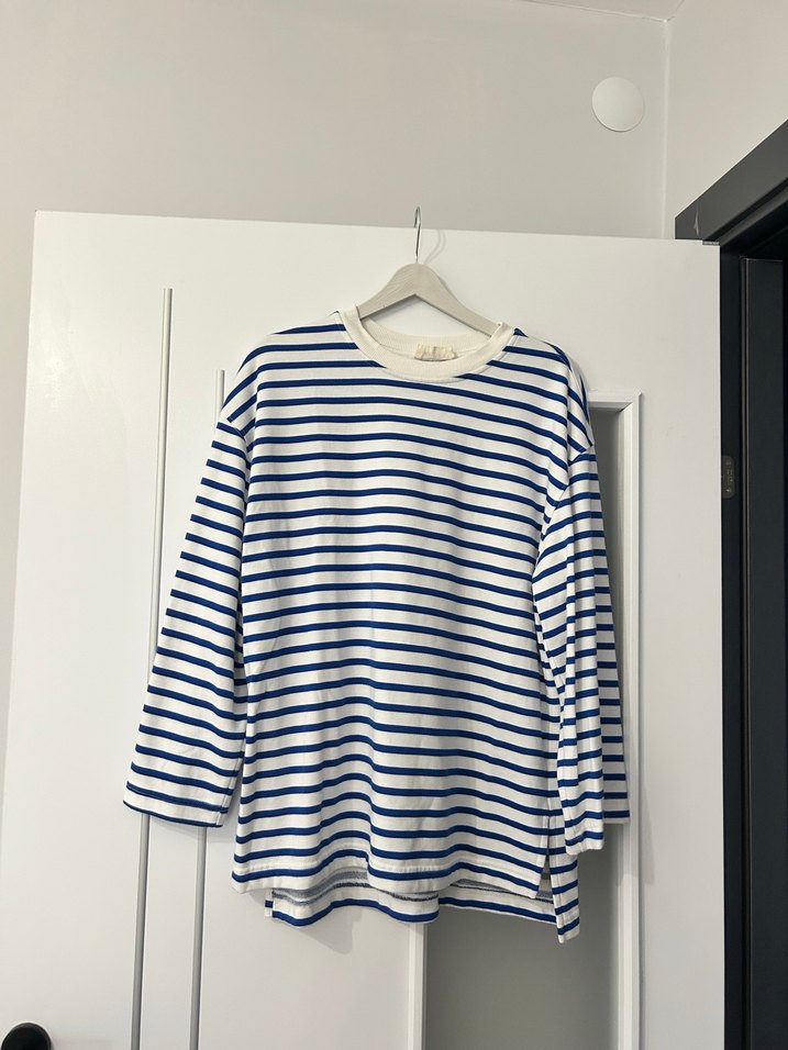 Pamuk kumaştan, uzun kollu ve yuvarlak yakalı tunik. mavi çizgili, midi boy ve bol kesim ile rahat ve şık bir Paris tarzı sunar.
