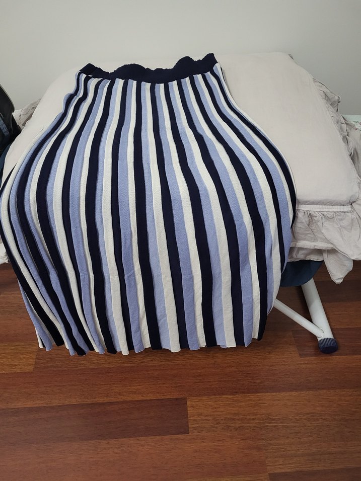 Triko kumaştan, piliseli uzun kadın eteği. Koyu mavi çizgili deseniyle bohem ve retro tarzlara uygundur.