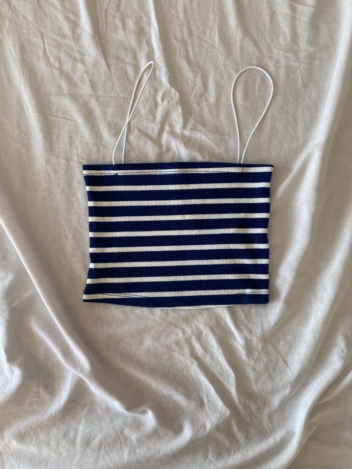 İnce beyaz askılı, koyu mavi ve beyaz çizgili kadın crop, normal midi boyda ve rahat bir kumaştan yapılmıştır.