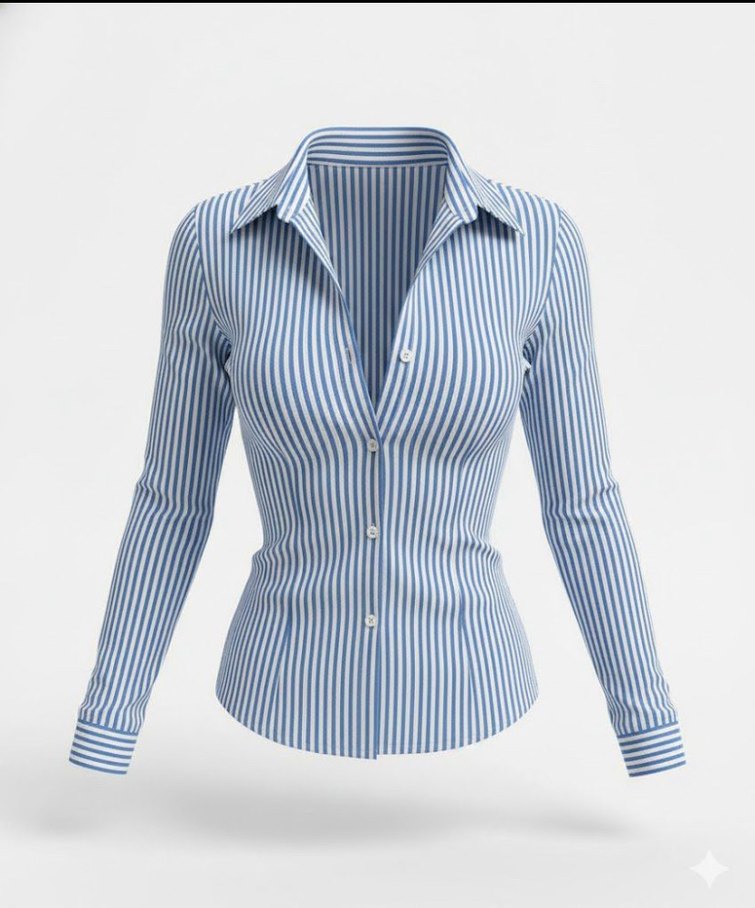 Mavi çizgili, uzun kollu ve düğmeli manşetlere sahip kadın gömlek. Dar kalıp ve notched lapel yakası ile ofis ve şık günlük kullanıma uygun.