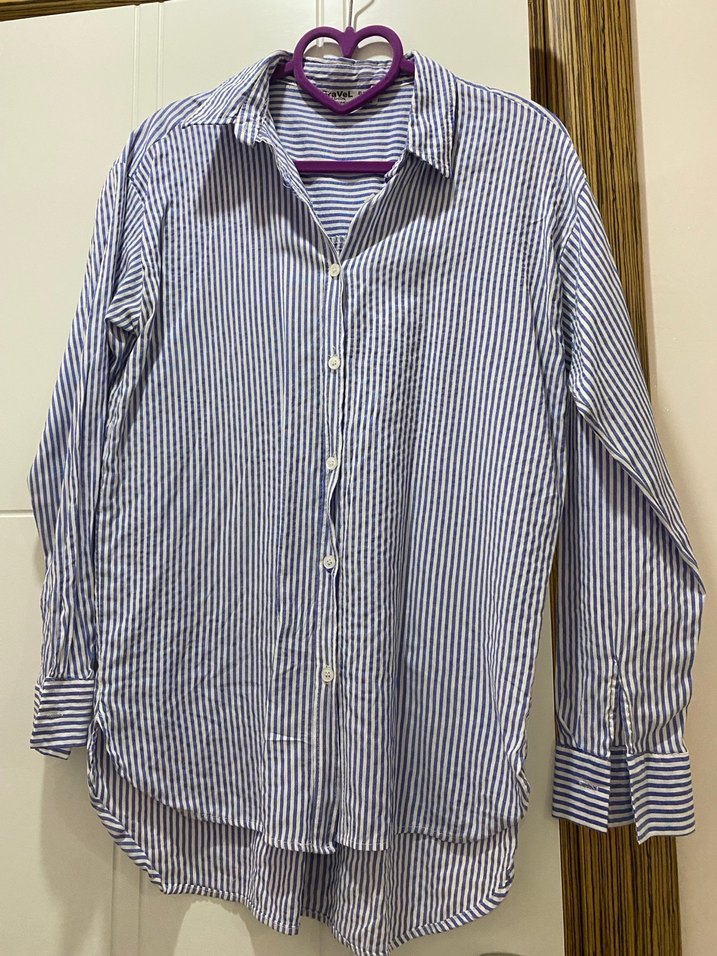 Mavi çizgili pamuklu gömlek, uzun kollu ve yakalıdır. Düğmeli ve normal boyda, rahat kesimlidir, günlük sokak stiline uygundur.
