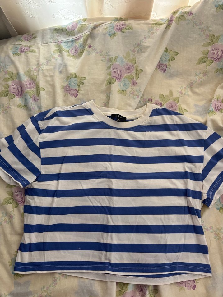 Kadınlar için kısa kollu, salaş kesim ve tekne yakalı tişört. Yumuşak pamuklu kumaş, mavi çizgili desenle günlük kullanıma uygun rahat model.