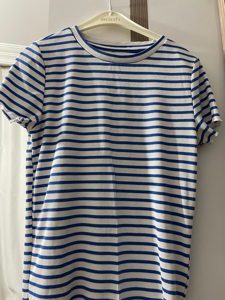 Pamuklu, mavi çizgili, kısa kollu, bisiklet yaka ve pileli detaylı kadın tişörtü. Günlük kullanıma uygun, rahat ve şık.