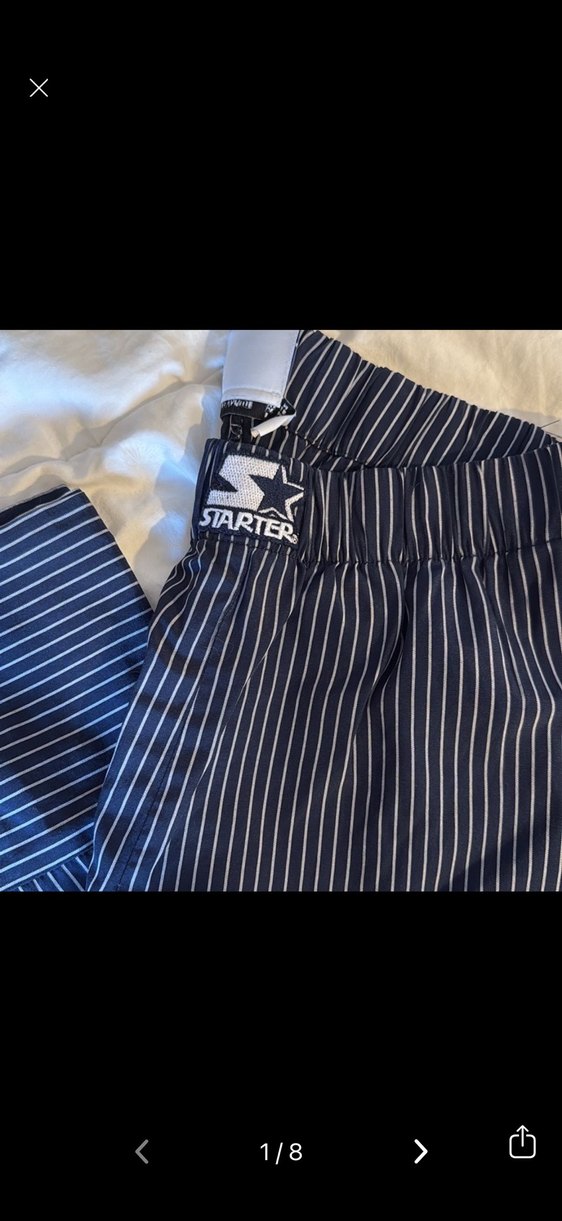 Koyu mavi çizgili kısa kumaş pantolon, pileli ve regular fit. Sentetik kumaştan üretilmiş, STARTER logosu bulunur. Trendy casual ve günlük kullanım için uygundur.