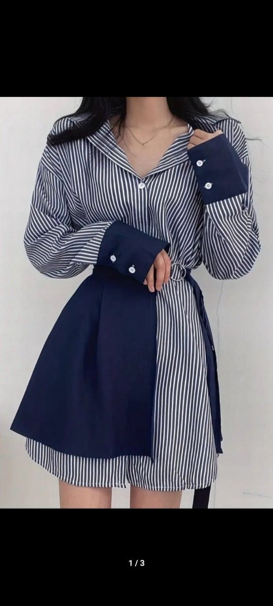 Kadınlar için uzun kollu, bol kesim, mavi çizgili ve pileli detaylı midi gömlek. Notch yaka ve kontrast renkli bölümüyle günlük kullanıma uygun.iki parça