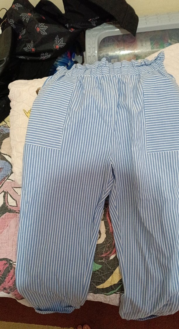 Mavi çizgili, pilili pamuk kadın pantolonu. Normal kesim ve rahat bir günlük stil için uygundur. göründüğü gibi hiç kusuru yoktur