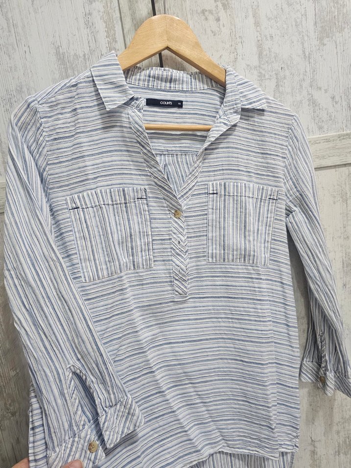 Mavi çizgili pamuklu gömlek, uzun kollu ve düğmeli. Yaka ve iki göğüs cebine sahip, rahat kesimli, günlük kullanıma uygun.