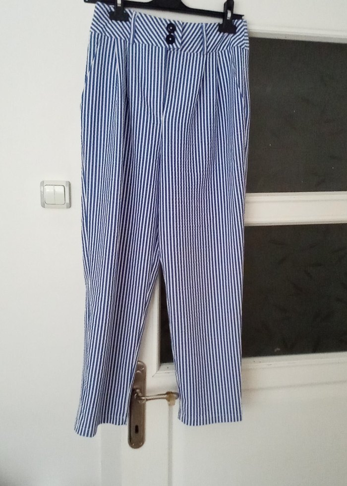 Mavi ve gri çizgili, pamuklu regular fit pantolon, pileli ve midi boy, günlük rahat kullanım için uygundur.