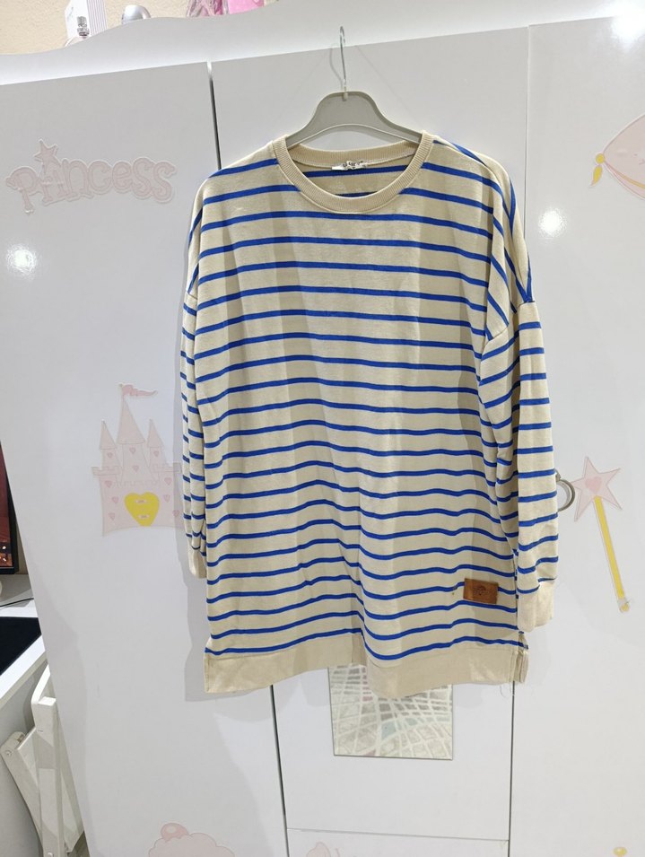 Kadın sweatshirt, uzun kollu ve yuvarlak yakalıdır. Pamuklu kumaştan yapılmış, açık mavi çizgili ve rahat kesimdir. Günlük kullanıma uygun, rahat sokak stili sunar.