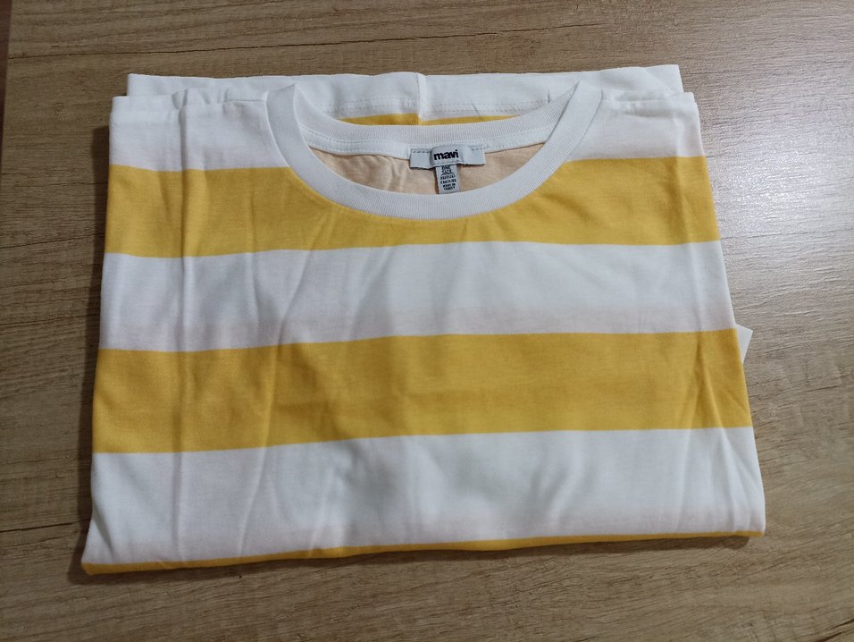 Pamuklu, sarı ve beyaz yatay çizgili, yuvarlak yakalı ve kısa kollu kadın tişörtü. Rahat kesimiyle günlük sokak stiline uygundur. M bedendir.