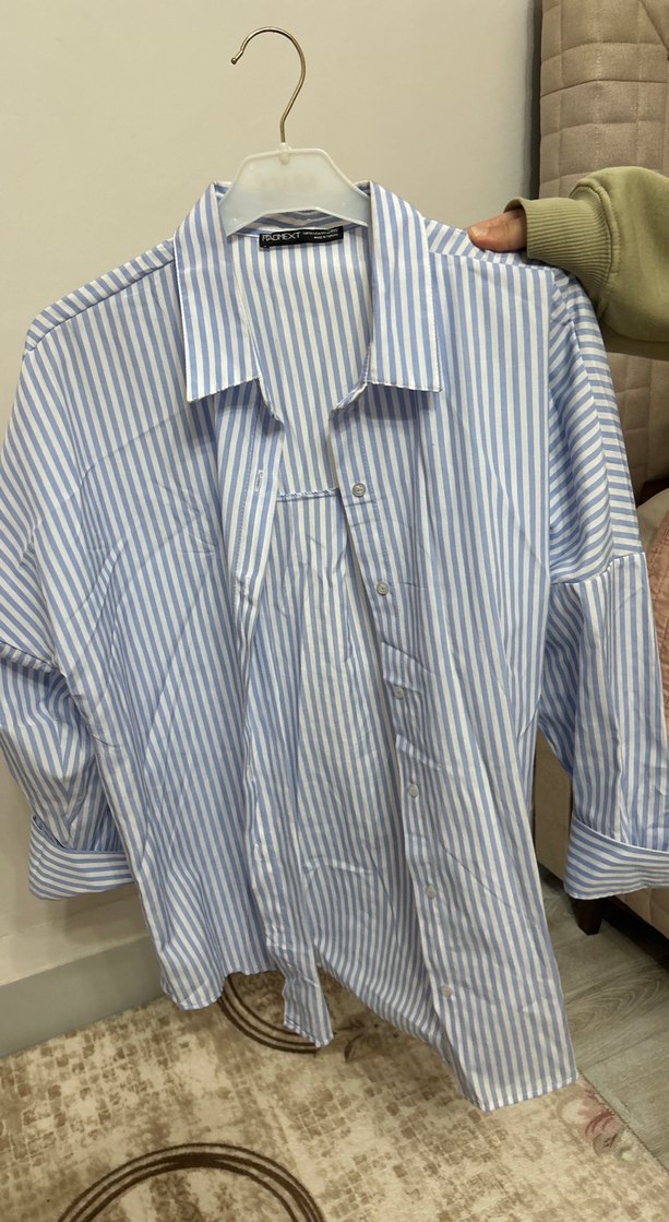 Mavi ve gri çizgili pamuklu gömlek, yakalı, düğmeli ve uzun kolludur. Normal kesim ve midi boyda, günlük rahat kullanım için uygundur.