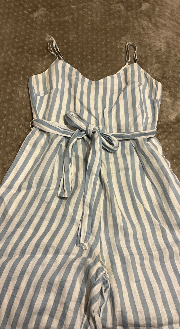 İnce askılı, kemerli ve çizgili desene sahip bu tulum, yumuşak keten kumaştan üretilmiştir. Mavi ve gri renklerde, bohem tarzda günlük kullanıma uygundur.