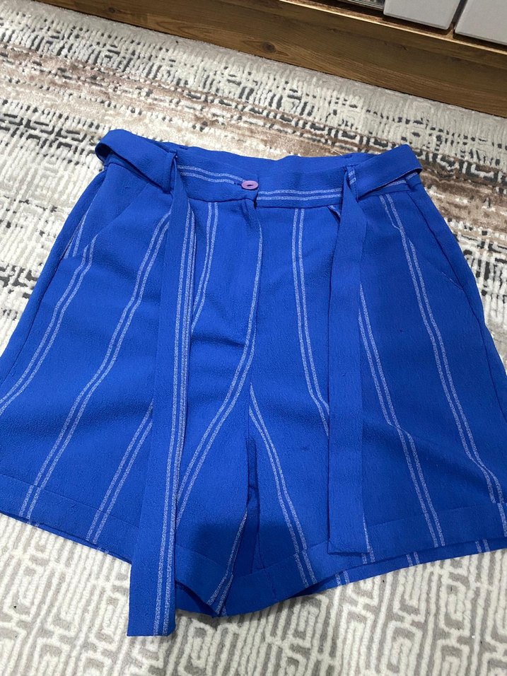 Mavi, parlak sentetik kumaştan, kemerli ve çizgili mini şort. Regular kesim ve rahat günlük sokak stili için uygundur.