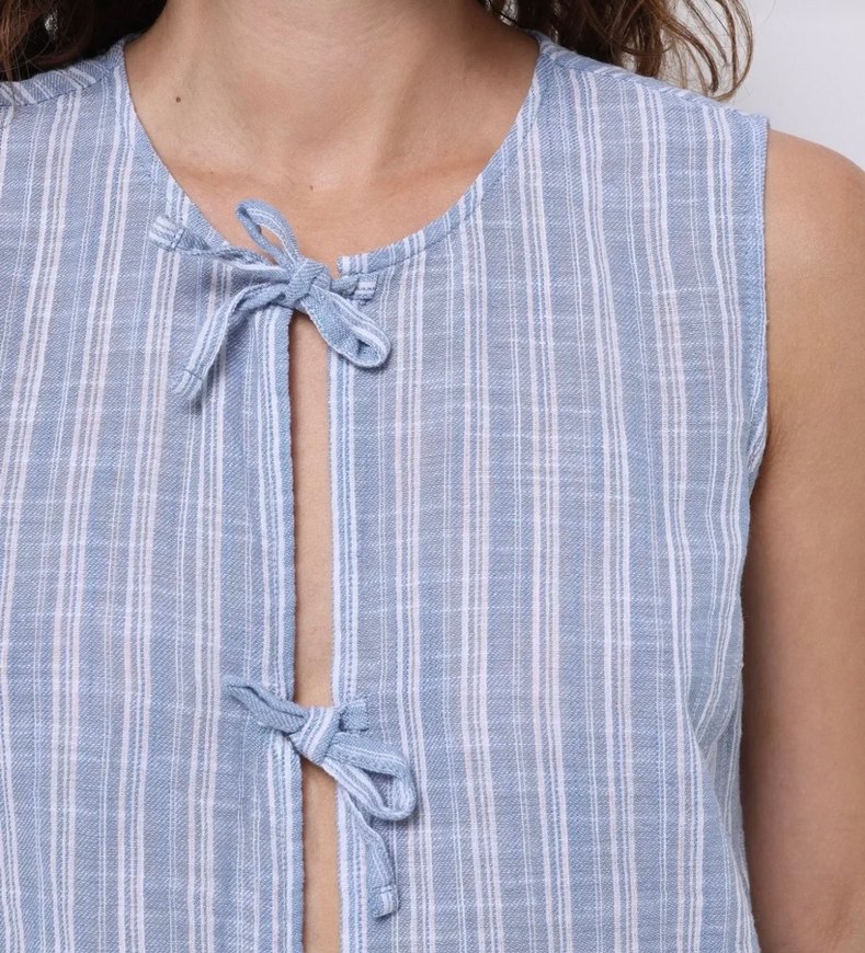 Mavi Çizgili Keten Düğmeli Kolsuz Bluz