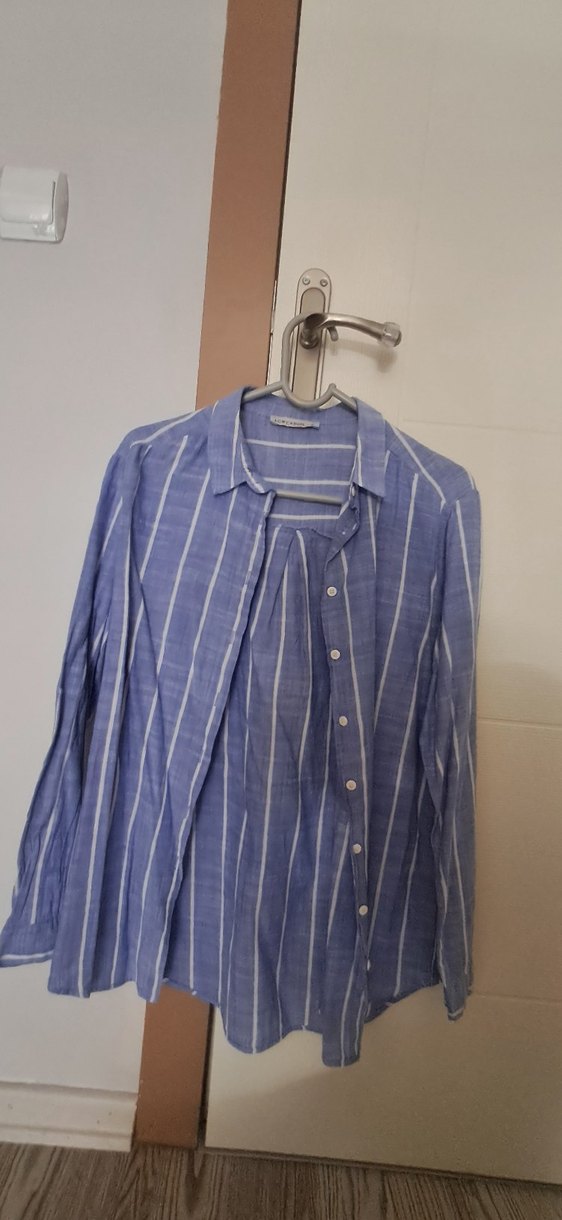 Gevşek kesim, uzun kollu mavi keten gömlek, beyaz çizgili ve yakalı. Düğmeli ön kısmı ile rahat, bohem tarzda günlük kullanıma uygun.