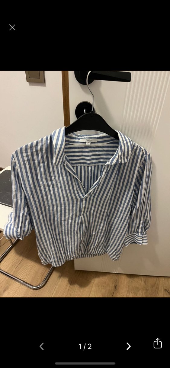Mavi ve gri çizgili, düğmeli, keten kumaştan, kısa kollu, yakalı ve bol kesim kadın gömlek. Rahat sokak stili için uygundur.