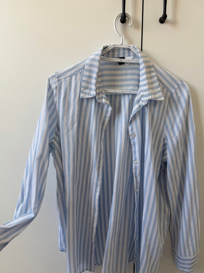 Mavi çizgili keten, bol kesim, uzun kollu, yakalı ve düğmeli kadın gömleği. Paris sokak modası tarzında, günlük kullanıma uygun. #H&M #gömlek