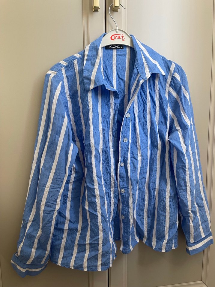 Bir kez giyildi Mavi çizgili keten gömlek, yakalı ve düğmeli. Uzun kollu, bol kesim, günlük rahat sokak stili için uygun. ✨