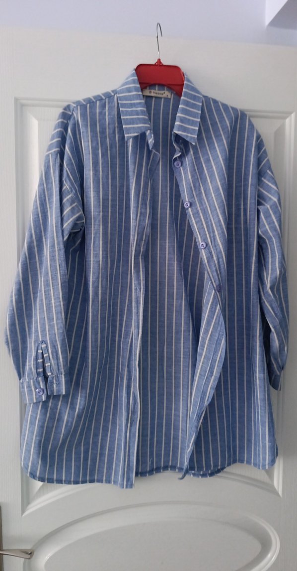 Mavi keten kumaştan, uzun kollu ve düğmeli ön kısmı olan bol kesim gömlek. Notlu yaka ve midi uzunlukta, ofis için uygundur. etikette m yazıyor ama L bedene kadar olur boyu 82 iki kol altı arası 56. lekesi yok, yırtığı yok, güzel kaliteli gömlek, açıklar,hamileler ve tesettür için uygundur.