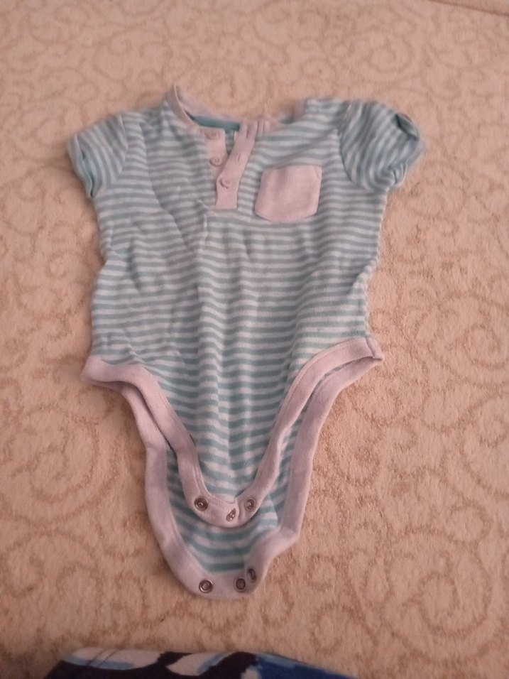 Kısa kollu, yakalı ve düğmeli mavi bebek body, küçük göğüs cebine sahip yumuşak sentetik kumaştan yapılmıştır. yırtık yoktur göründüğü gibidir hiç giyilmedi ihtiyacım olmadığı için satıyorum