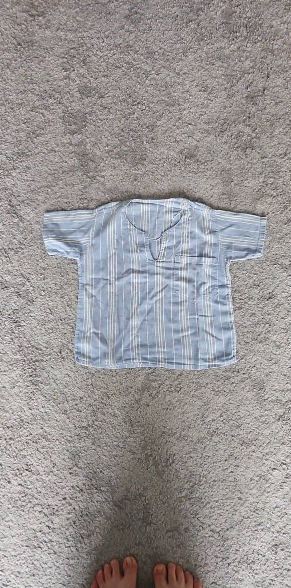 Yumuşak kumaştan, kısa kollu ve yakalı, düğmeli detaylı, mavi çizgili bol kesim çocuk gömlek.