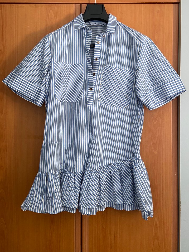 Mavi çizgili kadın gömlek, kısa kollu ve yakalıdır. Alt kısmı fırfırlı ve mini boydadır. Rahat kesimi ve sentetik kumaşıyla günlük kullanıma uygundur.