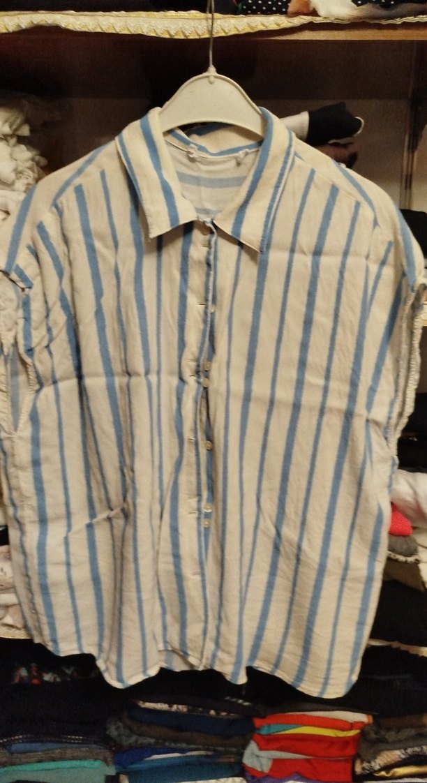 Açık mavi çizgili keten, kısa kollu, yakalı ve düğmeli gömlek. Rahat kesimiyle günlük kullanıma uygundur.