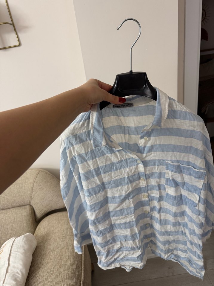 Mavi çizgili, keten kumaştan, kısa kollu, yakalı ve düğmeli bol kesim gömlek. Günlük rahat stil için uygundur. Etiketi l beden ama m gibi s giyenede olur deformesiz çok güzel yazlık keten kumaş