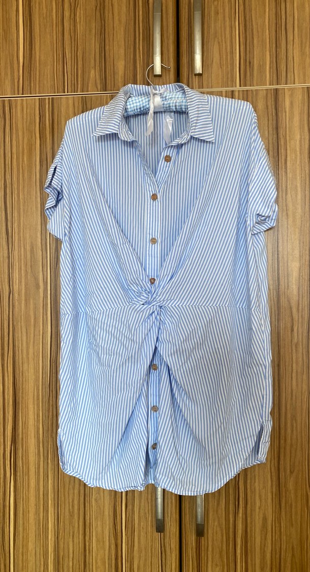 Mavi çizgili keten gömlek, kısa kollu, yakalı ve düğmeli. Midi boy, bol kesim ve günlük rahat stil için uygun.