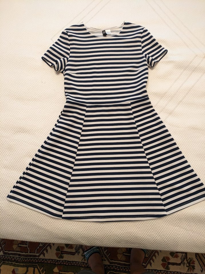 Mavi ve gri çizgili, kısa kollu, bisiklet yakalı, pile detaylı ve sentetik kumaştan yapılmış, vücuda oturan midi elbise. Günlük kullanım için uygundur.