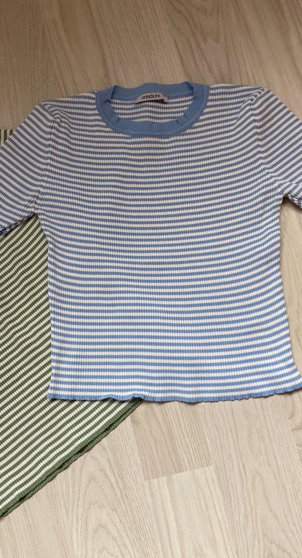 Kısa kollu, bisiklet yaka, esnek örme kumaş .Pastel mavi beyaz çizgili, örgü desenli ve yumuşak sentetik kumaştan üretilmiştir. Her bedene uygun