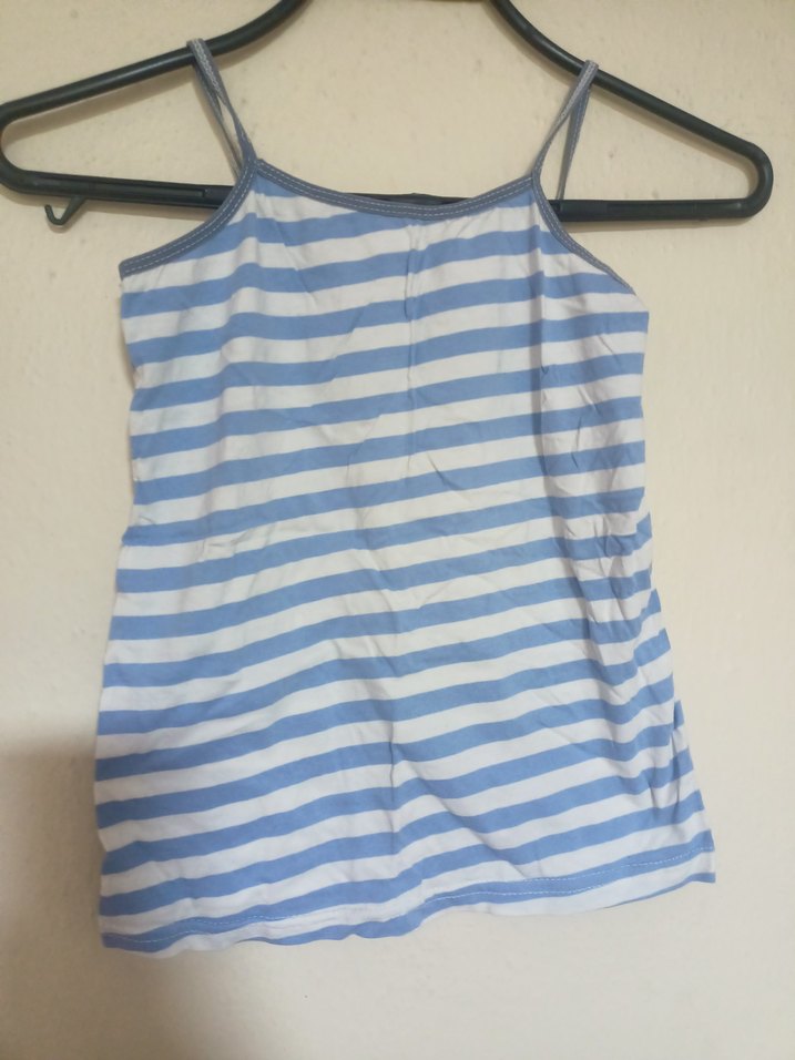 Pastel mavi ve beyaz çizgili, ince askılı kız çocuk atlet, yumuşak kumaştan üretilmiştir.