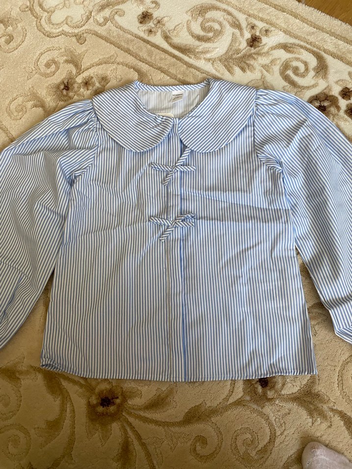 Yumuşak keten kumaştan, mavi çizgili, düğmeli, yakalı, uzun kollu, bol kesim kadın gömleği. Normal midi boy ve Paris tarzında günlük kullanıma uygun.
