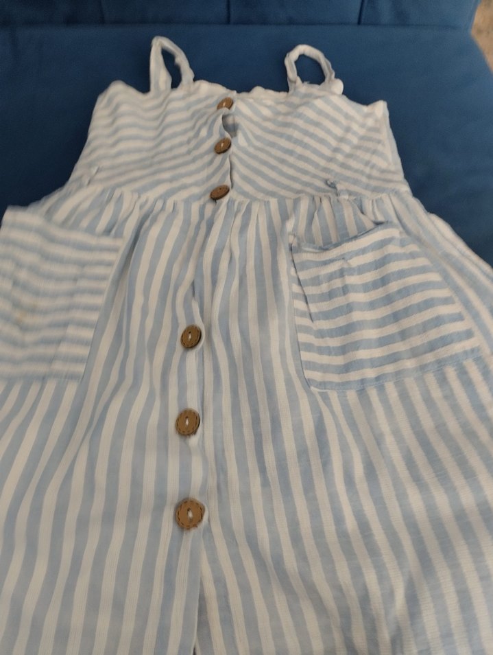 Mavi çizgili pamuklu, düğmeli, askısız ve cepli, salaş kesim kız elbisesi. Bohem tarzda rahat bir görünüm sunar.