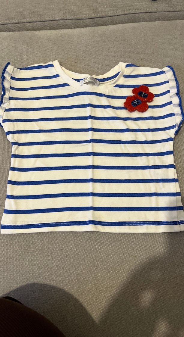 Bu kız tişörtü, mavi çizgiler, kısa kollar, yuvarlak yaka ve bol kesim özelliklerine sahiptir. kırmızı çiçek baskılıdır.