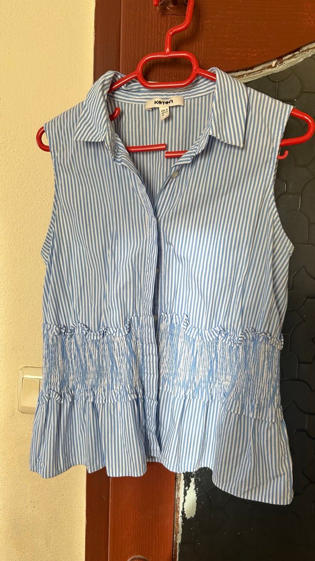 Mavi çizgili keten kolsuz gömlek, yakalı ve pileli bel detayıyla. Fitted kesim, midi boy ve günlük sokak stili için uygun.