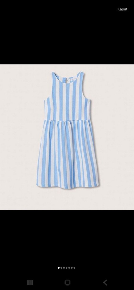 Kolsuz, mavi beyaz çizgili kız elbisesi, tekne yakalı ve pileli etekli. Rahat kesimli ve sentetik yumuşak kumaştan, trend sokak stili için uygundur.