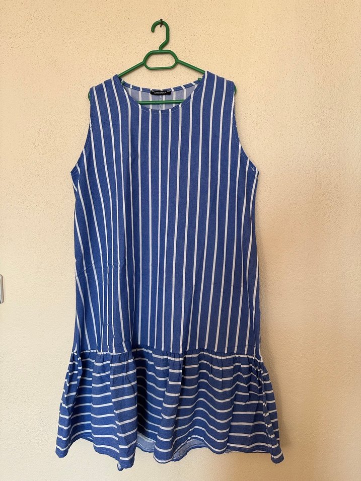 Mavi-beyaz çizgili, kolsuz, midi boy, bol kesim ve kayık yaka elbise. Etek kısmında fırfır detayı bulunur, yumuşak sentetik kumaştan üretilmiştir.