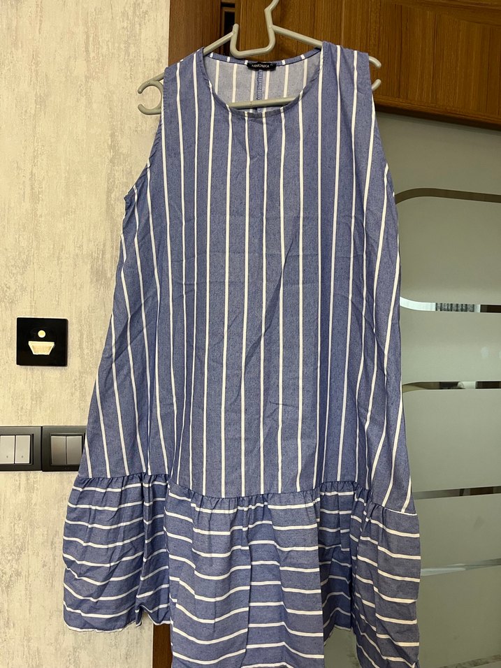 Mavi midi elbise, dikey ve yatay çizgilerle, bol kesim ve fırfırlı etek ucu ile günlük kullanıma uygun. Kolsuz tasarım rahatlık sağlar.