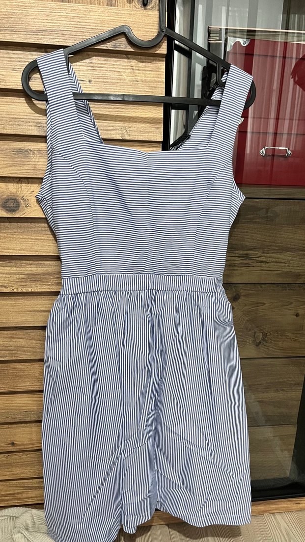 Kolsuz, tekne yakalı mini elbise, çizgili ve pileli etek detayıyla. Yumuşak pamuk kumaştan, rahat kesimli, günlük ve sokak stiline uygun. Mavi ve gri tonlarda.