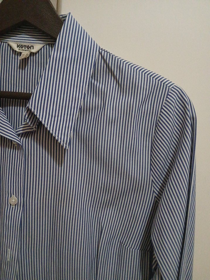 Koton markanın mavi çizgili kadın gömleği, yakalı, düğmeli ve uzun kolludur. Pamuklu, normal kalıp, ofis ve günlük kullanım için uygundur.