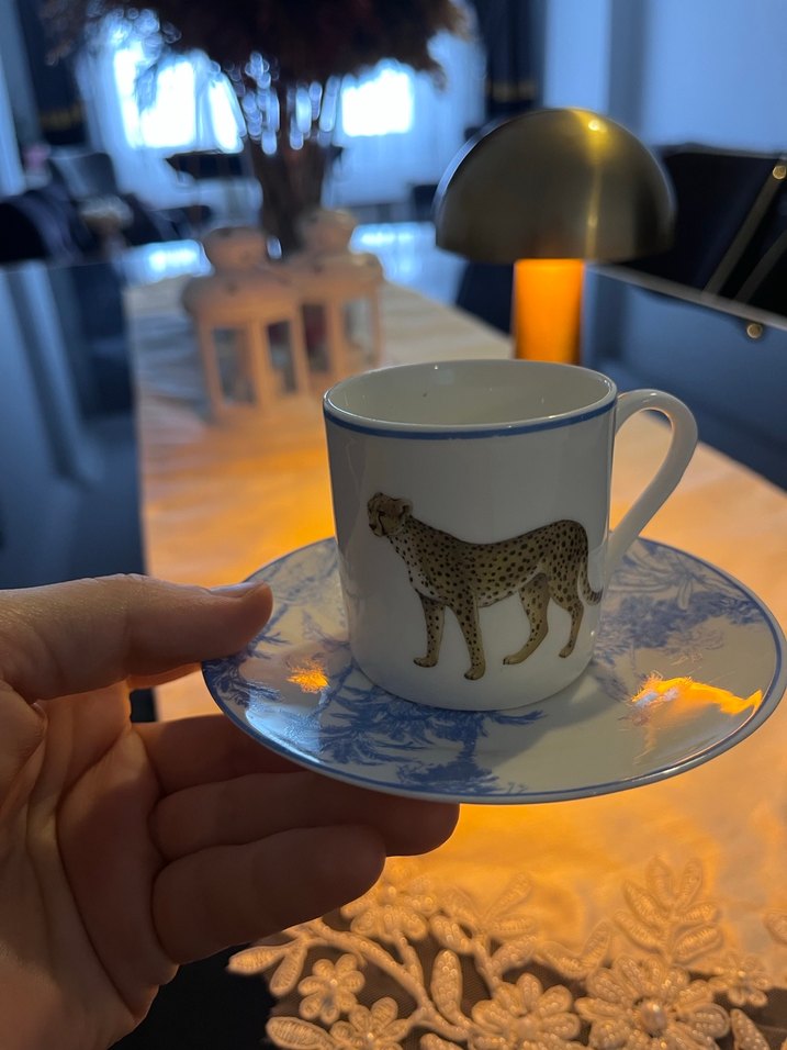 Mavi çizgili, leopar desenli fincan ve üzerinde mavi çiçek desenli uyumlu tabak. ☕