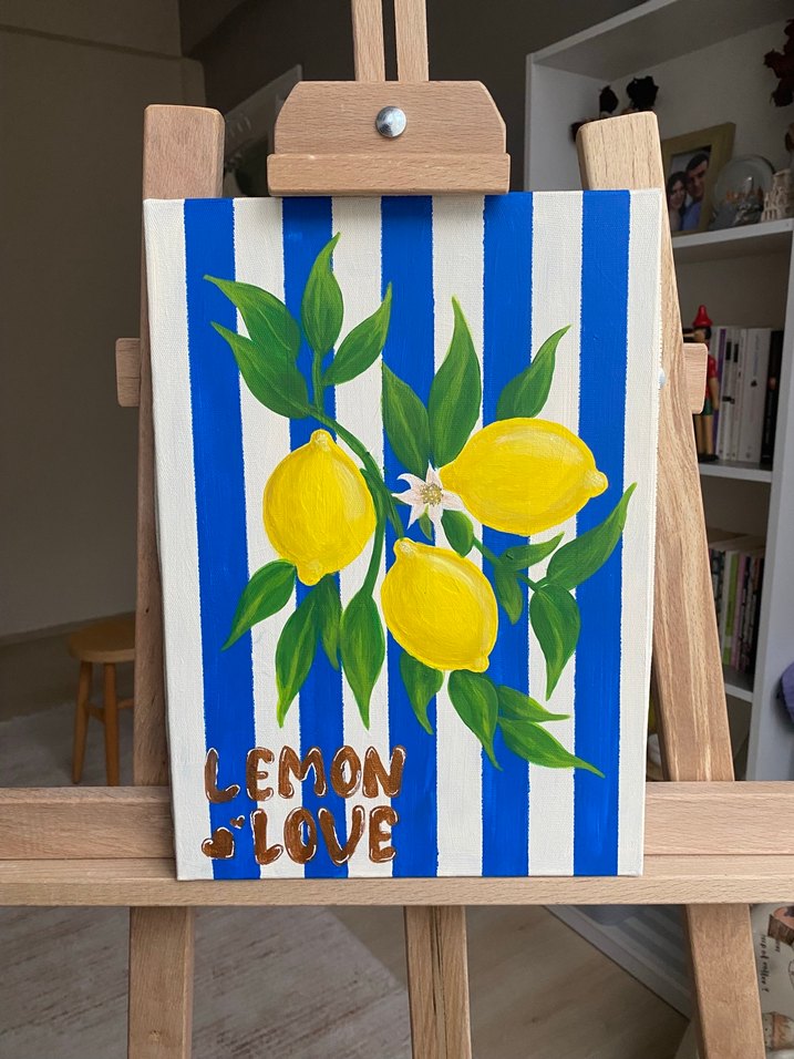 25 x 35 cm Mavi ve beyaz dikey çizgili arka planda, sarı limonlar ve yeşil yapraklar bulunan tablo. Altında altın sarısı 'LEMON LOVE' yazısı yer alıyor.