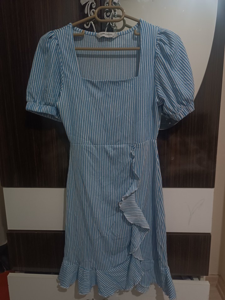 Mavi çizgili midi elbise, tekne yaka, kısa balon kollu ve fırfır detaylıdır. Rahat kesimi ve bohem tarzıyla günlük kullanıma uygundur.