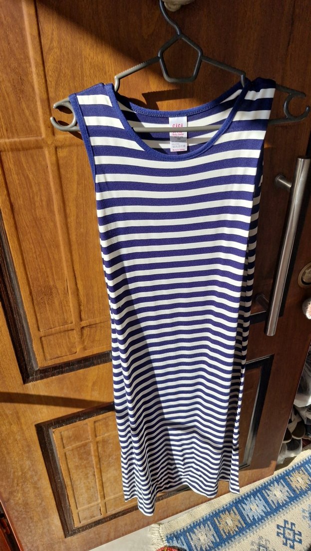 Mavi ve beyaz çizgili, parlak sentetik kumaştan yapılmış, tekne yaka ve pile detaylı, kolsuz ve vücuda oturan midi elbise.