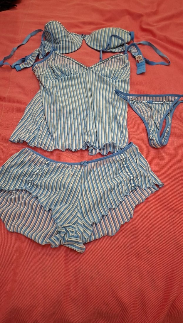 Fitilli, kısa askılı üst, şort ve tanga içeren mavi çizgili vintage tarzda kadın pijama takımı. Pastel renkli ve mini uzunlukta.